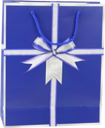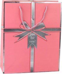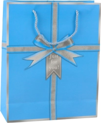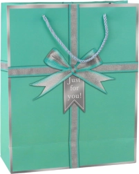 Elegantna darilna vrečka z motivom srebrne mašne in napisom "Just for you!" doda vsakemu darilu stilski videz. Izdelana je iz kakovostnega okrasnega kartona, ima čvrste vrvične ročaje in univerzalne mere 32 × 26 × 12 cm za manjša in srednje velika darila. Na voljo v 4 elegantnih barvah – modra, zelena, rožnata in svetlomodra.