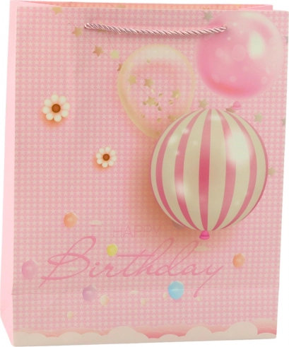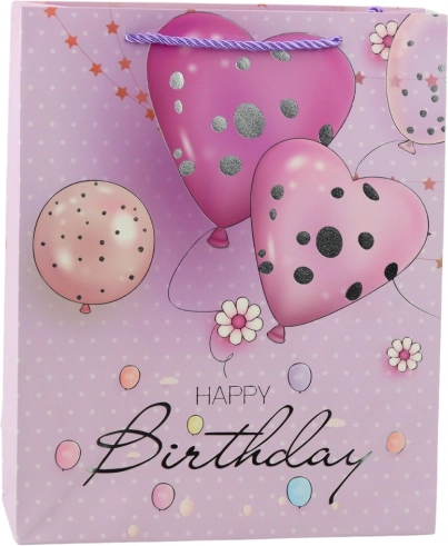 Darilna vrečka z veselimi baloni in elegantnim napisom Happy Birthday je odlična izbira za vsak rojstni dan. Združuje privlačen dizajn v rožnati, modri, vijolični in breskvasti barvi s praktično izvedbo, ki varno prenese tudi težja darila.