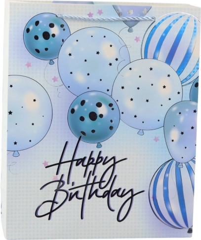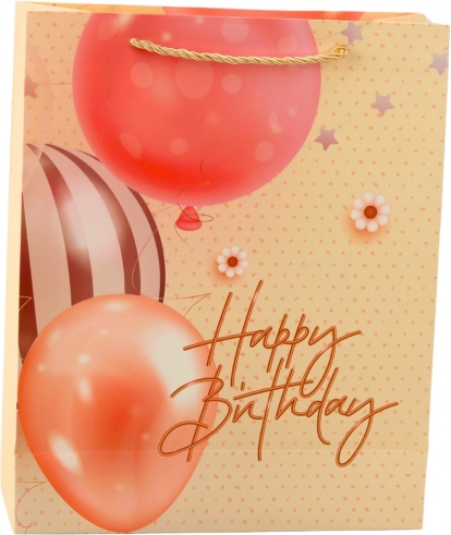 Stilska rojstnodnevna darilna vrečka z motivom balonov in napisom Happy Birthday doda vsakemu darilu eleganten in vesel videz. Izdelana je iz trdnega okrasnega kartona s čvrstimi vrvčnimi ročaji za udobno nošenje. Univerzalna mera 32 × 26 × 12 cm je idealna za manjša in srednje velika darila.