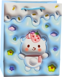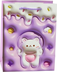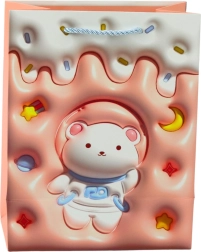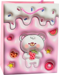 Ta darilna vrečka iz okrasnega kartona očara s pastelno paleto v rožnati, modri, oranžni in vijolični. Prisrčen medvedek z zvezdicami in sadnimi detajli ustvarja 3D učinek, kot da medvedek izstopa iz vrečke. Stajling dopolnjujejo barvno usklajeni vrvičasti ročaji za udobno in varno nošenje.