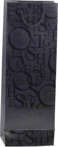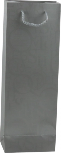 Elegantna darilna vrečka za steklenico iz kakovostnega papirja z minimalističnim dizajnom in reliefnim vzorcem črk. Ima čvrste pletene vrvične ročaje za varno prenašanje in je primerna za vino, peneča vina in domače limonade. Na voljo v 4 razkošnih barvah: črna, srebrna, grafitna in zlata.