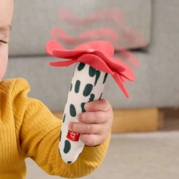 Komplet dveh mehkih igrač za najmlajše spodbuja vid, tip in sluh. Čebelica z zvončkom in rožica–ropotuljica sta zasnovani tako, da ju je lahko držati, spodbujata raziskovanje in krepita naravno radovednost otrok. Zahvaljujoč kontrastnim barvam, raznolikim teksturam in nežnim zvokom podpirata zgodnji senzorični razvoj.