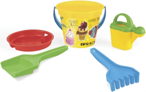 - 5-delni set: lopatka, grabljice, mlinček za pesek in vodo ali zalivalka, vedro 2 l