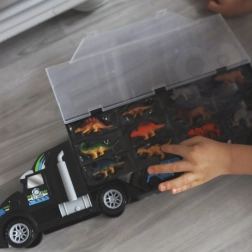 Odkrijte multifunkcijski tovornjak, ki je hkrati praktičen kovček in zabavna izstreljevalna postaja. Dvostransko tovorno ohišje s prozornim pokrovom sprejme skupaj 24 figuric ali avtomobilčkov, zato ima vsak svojo mesto in nič se ne izgubi. Set vključuje 6 dinozavrov, 6 živalic, mali avtomobilček in helikopter – vse pripravljeno za takojšnjo igro.