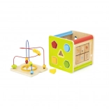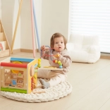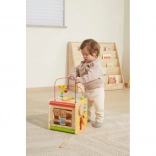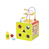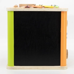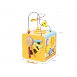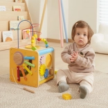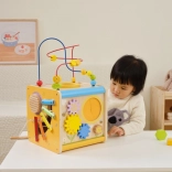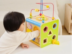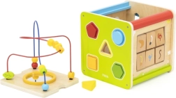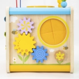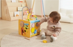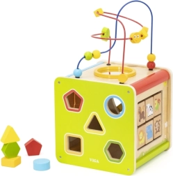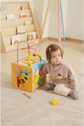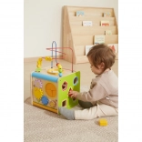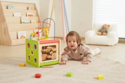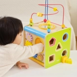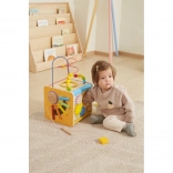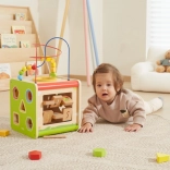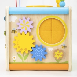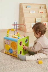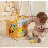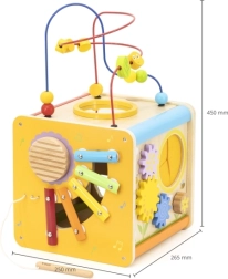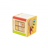 Masiven les in gladko obdelani robovi zagotavljajo varno uporabo, medtem ko žive barve in zabavni mehanizmi držijo pozornost malih raziskovalcev dolgo časa. Kocka je odlična za samostojno igro in skupne trenutke s starši.