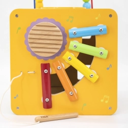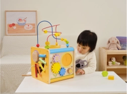 Odkrijte svet barv, oblik in zvokov s to leseno izobraževalno kocko 5-v-1. Ponuja labirint z kroglicami, vstavljanje oblik, zobnike, ure s premičnimi kazalci in glasbeni panel s ksilofonom. Stabilna lesena konstrukcija, žive barve in premišljene podrobnosti podpirajo fino motoriko, oko–roka koordinacijo, logično razmišljanje ter ustvarjalnost otrok od približno 18 mesecev naprej.
