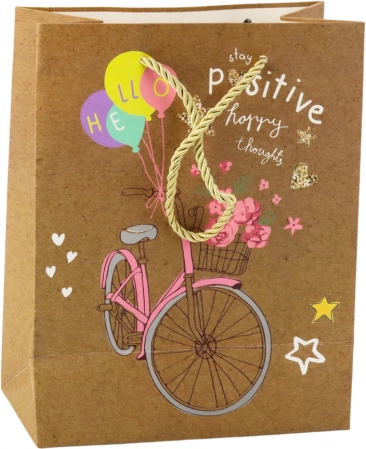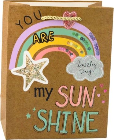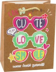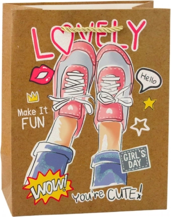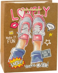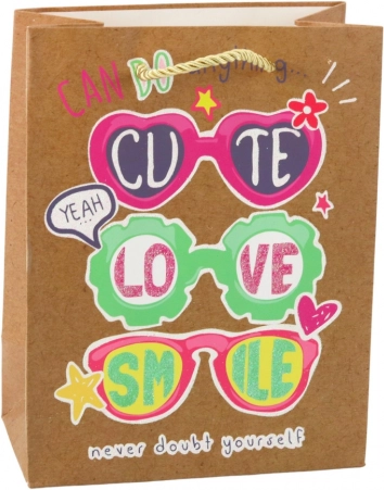 Vrečko odlikujejo štirje različni motivi, vsak očarljiv z živahnimi barvami in pozitivnimi slogani, ki poudarjajo mladostni in optimistični značaj. Močni vrvni ročaji zagotavljajo udobno prenašanje in so barvno usklajeni z dizajnom. Vrečka z merami 23 x 18 x 10,5 cm je idealna za pakiranje srednje velikih in manjših daril, kot so kozmetika, modni dodatki, knjige ali sladkarije.