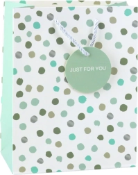 Darilna vrečka s pikami je idealna rešitev za zavijanje daril za vsako priložnost. Izdelana je iz kakovostnega okrasnega kartona z nežnim vzorcem pik v odtenkih srebrne, zelene in črne, kar prinaša moderen in stilski videz. Primerna je za rojstne dni, obletnice in druge praznične dogodke.
