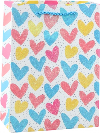 Ta darilna vrečka je izdelana iz trpežnega okrasnega kartona, ki zagotavlja njeno obstojnost in estetski videz. Motivi z barvitimi srčki, zvezdicami, pikicami in črtami vrečki dodajo lahkoten in zabaven značaj, ki odlično pristaja različnim vrstam daril. Močni vrvni ročaji v ujemajoči se barvi omogočajo udobno prenašanje.