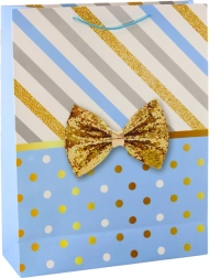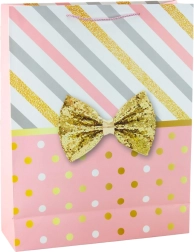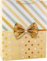 Velika darilna vrečka z edinstvenim dizajnom črt in pik v zlati barvi, dopolnjena z okrasno pentljo.