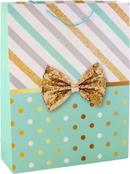 Ta čudovita darilna vrečka pritegne pozornost z združitvijo klasične estetike in modernega sloga. Na voljo v štirih pastelnih barvah – mint zelena, modra, rožnata in breskova – ponuja možnost izbire različice, ki se najbolje poda značaju dogodka ali željam obdarovane osebe.