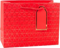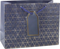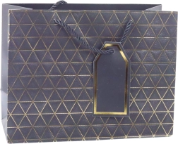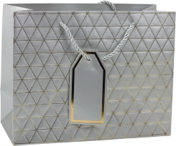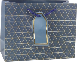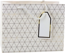 Ta moderna darilna vrečka se ponaša z geometrijskim vzorcem v obliki trikotnikov, okrašenih z zlatimi linijami. Na voljo je v šestih elegantnih barvnih različicah: bela, modra, srebrna, rdeča, siva in antracitna. Vsaka vrečka je opremljena z ustreznim vrvnim ročajem in obeskom za personalizacijo.