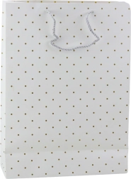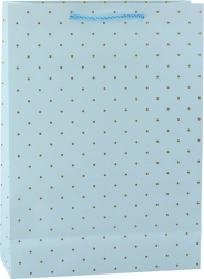 Slogovna darilna vrečka z nežnim vzorcem zlatih pik je idealna rešitev za tiste, ki dajejo prednost klasiki, preprostosti in eleganci. Zaradi svoje univerzalne in hkrati nežne zasnove je odlična izbira tako za formalne kot tudi osebne priložnosti. Vrečka je na voljo v štirih pastelnih, zadržanih odtenkih – svetlo modri, bež, beli in turkizni – ki se enostavno prilagodijo priložnosti, vrsti darila ali osebi, ki jo obdarujete. Zlati, sijoči potisk v obliki pik daje celoti plemenit karakter in je eleganten dodatek preprostemu ozadju.