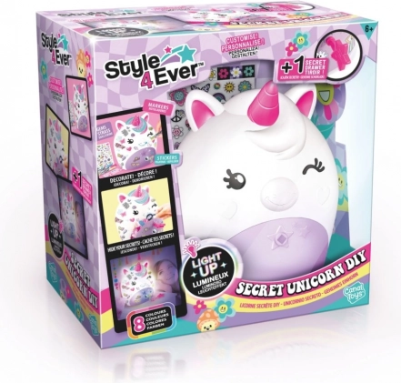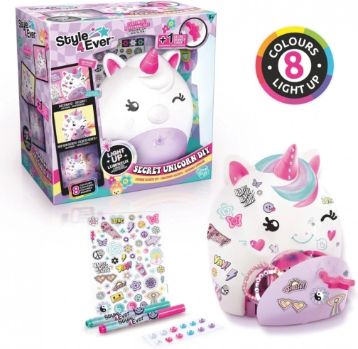 DIY lučka samorog Style4Ever s skritim predalom. Sveti v 8 barvah, priloženi flomastri, nalepke in kamenčki. Kreativna zabava za otroke od 6 let.