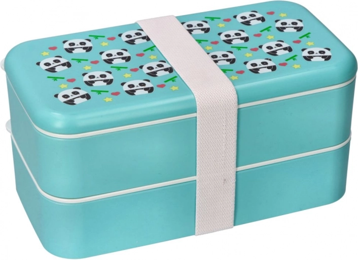 Slogovna dvonadstropna bento škatla v turkizni barvi z igrivim motivom pande ohranja vašo hrano svežo in ločeno. Zahvaljujoč kompaktnim meram 20 × 10,6 × 10 cm se prilega šolski torbi ali delovni torbici, elastični trak pa zanesljivo drži vse skupaj.