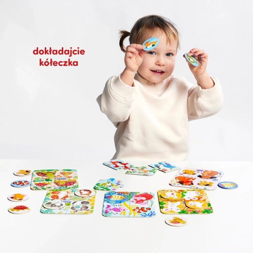 Odkrijte zabavne otroške sestavljanke, ki so hkrati tudi prva preprosta igra. V paketu najdete 6 štiridelných sestavljank z živalmi in 12 okroglih žetonov za ujemanje. Odlično za razvoj fine motorike, zaznavanja in potrpežljivosti – nato pa hop na prvo namizno igro iz vaših dokončanih slik!