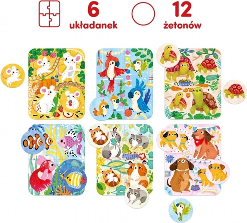 Prisrčne ilustracije priljubljenih ljubljenčkov – mišk, psov, ribic, hrčkov, želv in skobčevk – vabijo k sestavljanju in prvemu igranju. Najprej otroci sestavijo 6 štiridelskih prizorov, nato jim priredijo 2 tematska žetona in spremenijo sestavljanko v preprosto igro opazovanja in ujemanja.