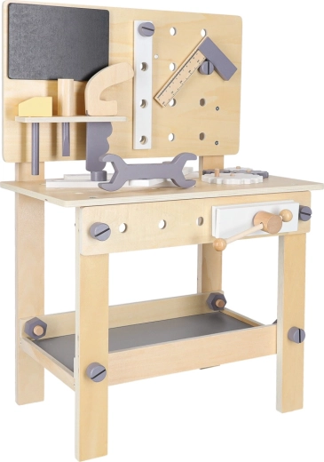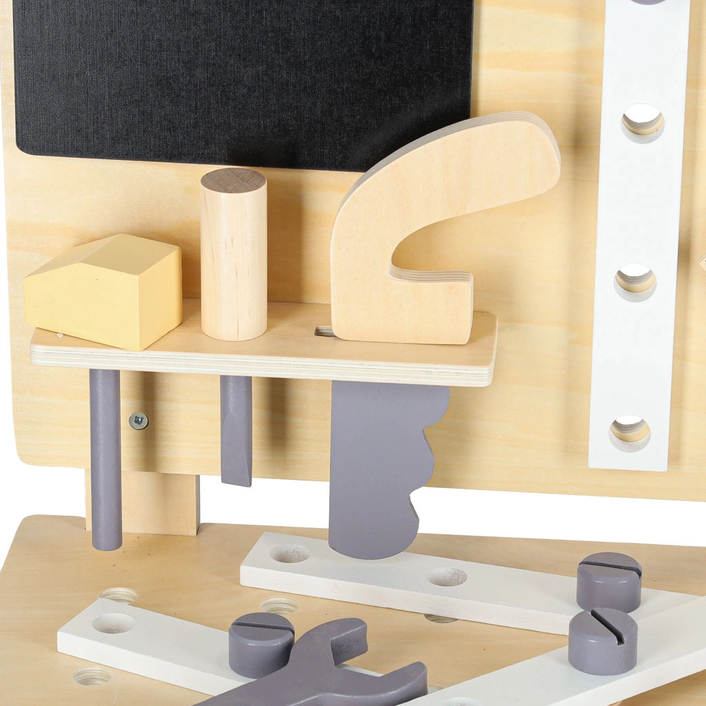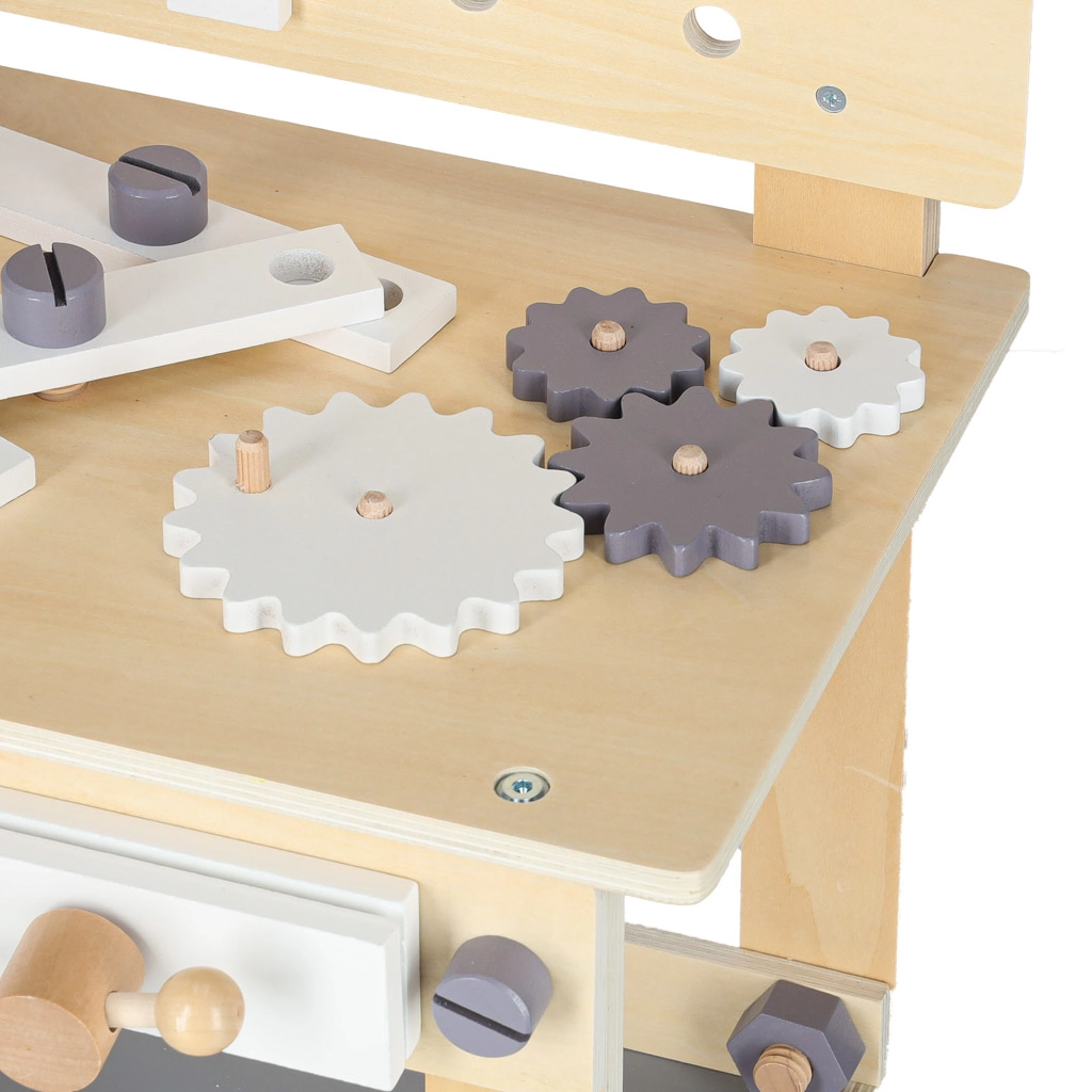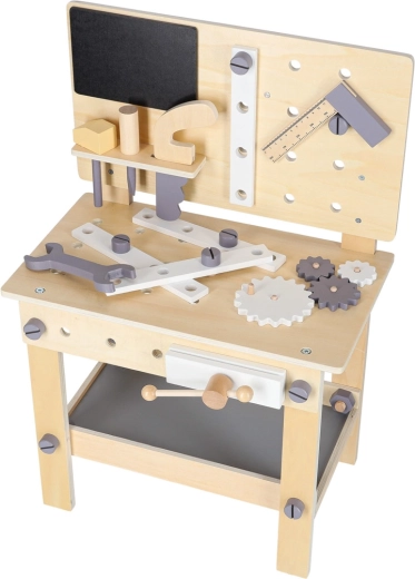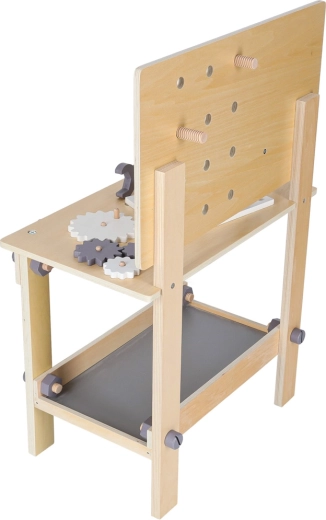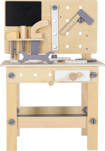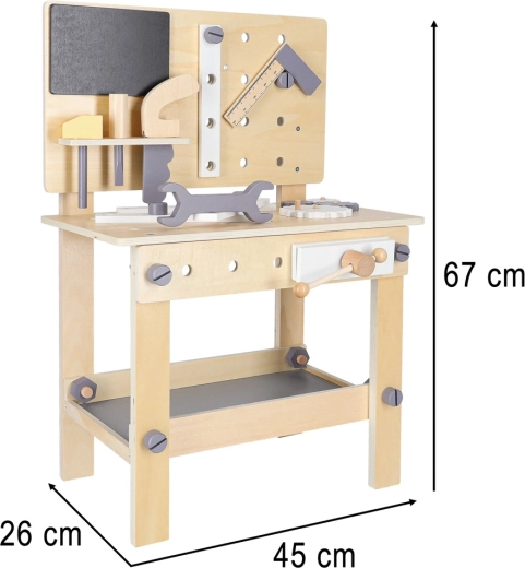 Stilska lesena delovna miza za male mojstre prinaša ure ustvarjalne igre in učenja. V kompletu so kladivce, izvijač, ključ, žaga, merilo, vijaki, matice, zobata kolesa ter funkcionalno primež. Trdna konstrukcija, odlagalna polica in perforirana stena spodbujajo red ter razvoj fine motorike in logičnega razmišljanja.