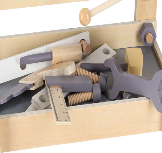 Lesena delovna miza je idealna za otroke, ki obožujejo popravljanje in sestavljanje. Z bogatim kompletom orodij in dodatkov lahko preizkusijo vijačenje, zabijanje, merjenje ter vrtenje zobnikov. Stabilna izvedba v nevtralnih barvah se odlično poda v otroško sobo.
