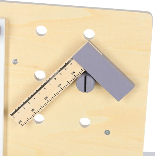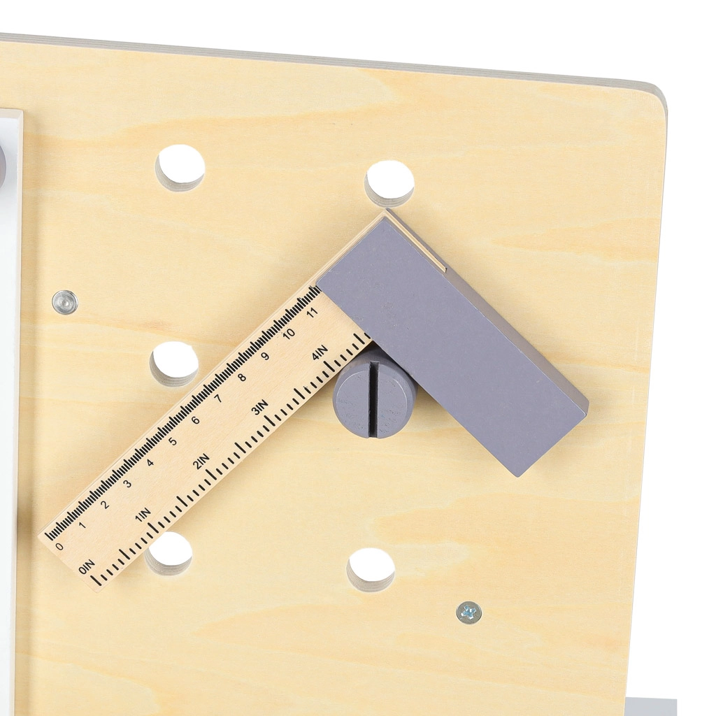 Funkcionalen ročaj primeža in plošča z luknjami omogočata otrokom varno vpetje delov in urjenje osnovnih veščin, kot pri pravi delavnici.