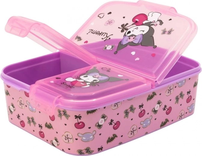 Praktična škatla za malico z motivom KUROMI ponuja 3 ločene predelke za pregledno shranjevanje hrane. Izdelana je iz vzdržljivega materiala, ne vsebuje BPA in z uradno licenco razveseli vse male oboževalce. Idealna za v šolo, na igrišče in na izlete.