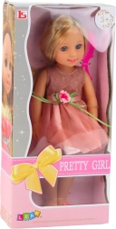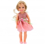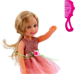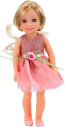 Punčka je oblečena v čudovito, bleščečo obleko s tilastim krilom, okrašeno z nežnim cvetom in zelenim trakcem, kar poudari njen dekliški značaj. Celoten videz dopolnjujejo rožnati čeveljčki, popolno usklajeni z obleko. Gibljive roke in noge zagotavljajo, da je punčka ne le vizualno privlačna, temveč tudi zelo funkcionalna pri igri – možno jo je prosto postavljati, posaditi ali “plesati” v domišljenih prizorih.