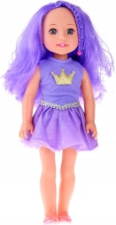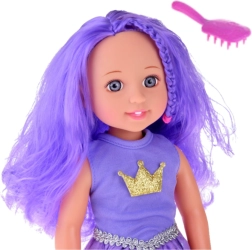Punčka je oblečena v vijolično obleko s svetlečo kronico na prsih in nežnim srebrnim pasom, kar ji daje kraljevski videz. Njene rožnate balerinke popolno dopolnjujejo celoten outfit. Zahvaljujoč premičnim rokam in nogam lahko punčko postavite v različne položaje, kar otrokom omogoča ustvarjanje lastnih zgodb. Izdelana iz trpežne plastike je pripravljena na vsakodnevno, intenzivno igro.