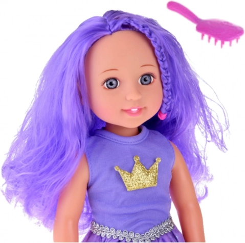 Punčka z vijoličnimi lasmi, vijolična obleka in krtača za lase