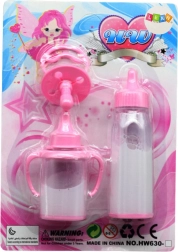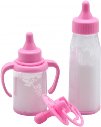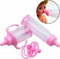 Vsebuje dve različni steklenički in dudo v nežni roza barvi. Popolno za igranje vlog in simulacijo nege punčk.
