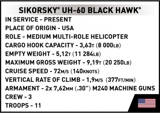 Model helikopterja Sikorsky UH-60 Black Hawk je zasnovan na podlagi uradne licence podjetja Sikorsky Aircraft Corporation. Ta sloviti vojaški helikopter je znan po svoji zanesljivosti, mobilnosti in sposobnosti delovanja v ekstremnih razmerah.