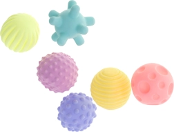 Set vsebuje šest žogic z različnimi strukturami: majhnimi in velikimi izboklinami, vdolbinami, trakovi in ježki s konicami. Uči koordinacijo, prepoznavanje barv in oblik ter zagotavlja sprostitveno masažo, ki pomirja in pripravlja otroka na spanje.