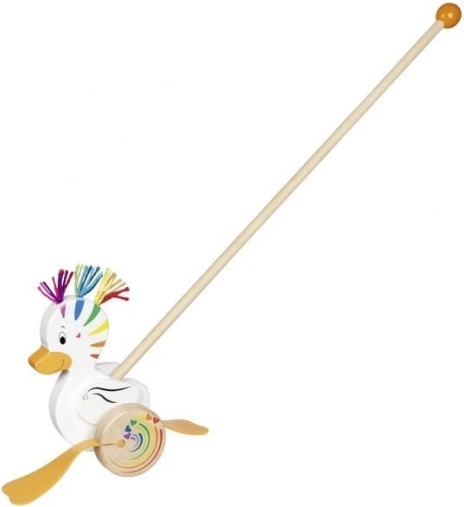 Mavrična račkica Lou je klasična potiskalna igrača, ki otroke motivira k gibanju. Z živahnimi barvami in gladkim pomikanjem prinaša veselje ob hoji ter hkrati krepi samozavest pri korakih in koordinacijo rok ter nog.