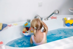 Osnovo preprosto pritrdite na gladko površino kadi ali stene prhe. Igrača stoji stabilno in je vedno pri roki.