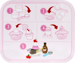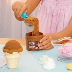 Vključuje poseben modelirni pesek za lahko oblikovanje kepic, receptno kartico za učenje postopkov korak za korakom in bogato opremo dodatkov za realistično pripravo sladoleda v otroški kuhinji.