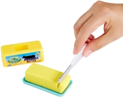 Realističen kos masla na pladnju s pokrovom in otroškim nožem pomaga razvijati fino motoriko ter posnemati pripravo hrane.