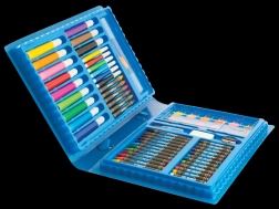 Ta univerzalni set bo razveselil vsakega malega ustvarjalca. V trpežni plastični škatli najdete vodene barve, flomastre, voščenke in barvice, dopolnjene z šilčkom in radirko. Zaradi pregledne razporeditve ima vsak del svoje mesto, komplet pa je enostavno prenosljiv.
