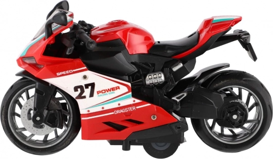 Majhen dirkalni motor dolžine 13 cm prinaša veliko zabave. Zahvaljujoč funkciji vzmetnega pogona (pull-back) švigne naprej po gladki podlagi, svetlobni učinki in zvok motorja pa še okrepijo realističen občutek vožnje. Idealno za male navdušence nad hitrostjo od 3 let naprej.