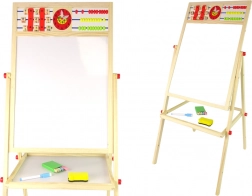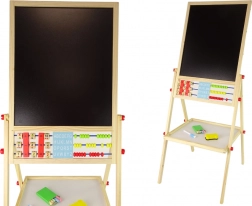 Lesena dvostranska tabla je idealna izobraževalna igrača za otroke od 3. leta dalje. Stabilna konstrukcija na nogah zagotavlja varno igro. Kombinacija dveh površin, ene kredne in druge magnetne, ponuja številne možnosti igre:
