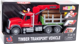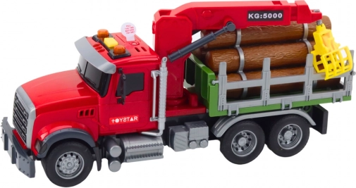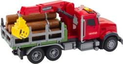 Ta rdeči gozdarski tovornjak je pripravljen na nakladanje in prevoz lesa. Zadnja prikolica z gibljivim žerjavom in prijemalom omogoča enostavno dvigovanje in premikanje hlodov, ki so del kompleta. Upravljanje roke žerjava poteka z gumbi na vozilu, zato bodo otroci uživali v realistični in varni igri.