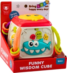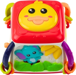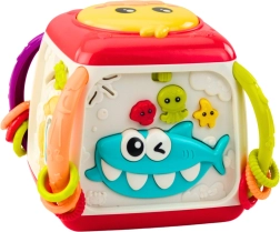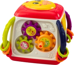Kocka vsebuje interaktivne elemente, kot so glasbeni gumbi in vrtljena zobnika, ki otroku nudijo ure zabave in spodbude.