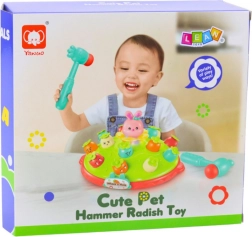 "Udar zajčka s kladivom" je igrača, zasnovana tako, da nudi zabavo, polno gibanja, zvoka in barv. Otrok lahko s kladivcem z mehkim koncem udari po korenčkih na platformi, kar aktivira mehanizem, zaradi katerega zajček poskoči, in izazove valove smeha. Platforma predvaja veselo melodijo, ki pritegne in motivira otroka za nadaljnjo igro.