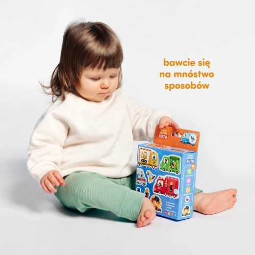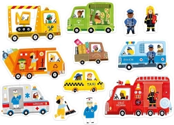 Zabaven komplet prvih sestavljank za najmlajše: 8 dvodelnih slik pisano obarvanih vozil in 4 figurice likov za še več igre. Razvoj fine motorike, vadba pozornosti in učenje novih besed v eni igri. Klasično spajanje koščkov olajša prve korake, končane slike pa vabijo k dodatnim dejavnostim.