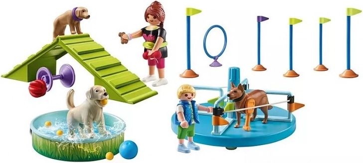 - 2 figurici otrok, več psov, ovire (obroč, slalom, gugalnica/bralnica, rampe), dodatki