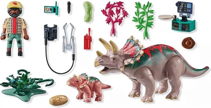 Podajte se na odpravo v prazgodovino z družino triceratopsov. Realistični figuri dinozavra in mladiča, figura raziskovalca ter podrobni dodatki (rastline, jajce, raziskovalna orodja) omogočajo otrokom ustvarjati lastne zgodbe, opazovati vedenje dinozavrov in se učiti skozi igro. Priložena je tudi karta znanja o dinozavrih za še več zanimivosti.