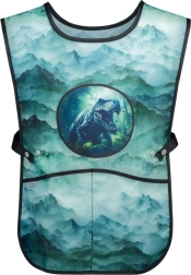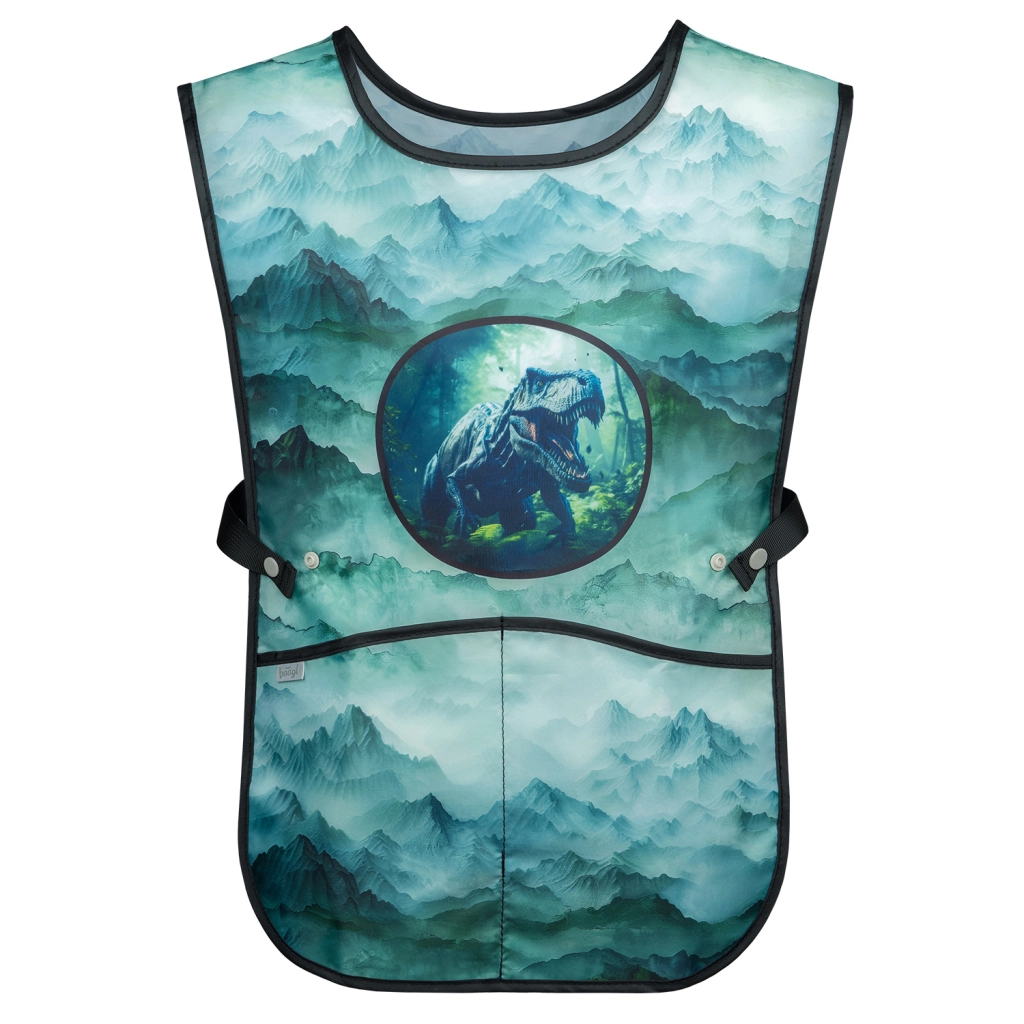 Otroški predpasnik DINO je praktičen predpasnik za likovni pouk ali delovne aktivnosti, opremljen z dvema žepoma.