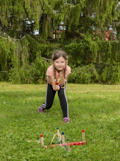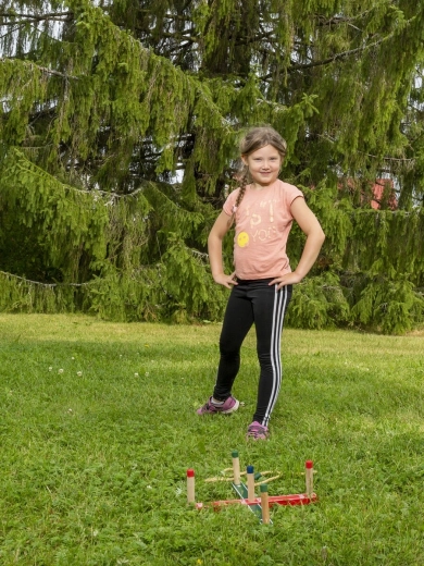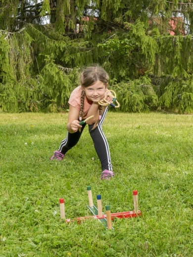 Zaradi odpornega lesa in lahkih obročev je igra idealna za otroke in odrasle. Preprosto se prenaša in hitro pripravi za igranje na travniku, na vrtu, v parku ali na dopustu.