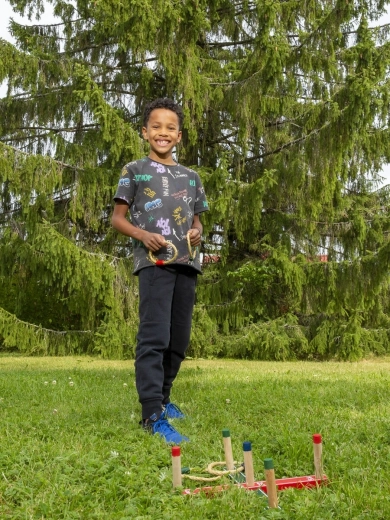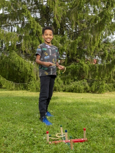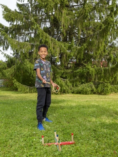 Pripravi se, nameri in vrzi! S to leseno igro metanja obročev se bo zabavala vsa družina. Klasična zunanja igra za vrt ali park ima preprosta pravila, spodbuja pozornost in koordinacijo ter je varna zahvaljujoč vrvnim obročem in čvrsti leseni konstrukciji.