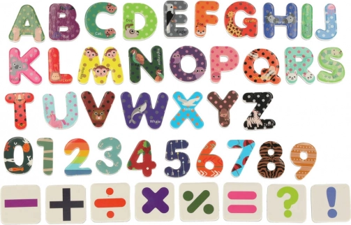 V kompletu so različni učni pripomočki, kot so magnetne črke, številke, krede in flomastri.