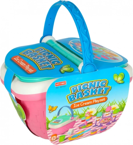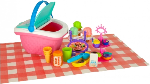 Piknik koš z igračami in sladicami, idealen za otroke 3+. Vključuje sladolede, krofe, mleko in drugo za zabavo na prostem.
