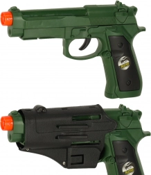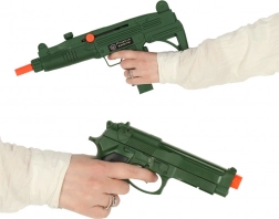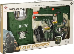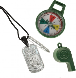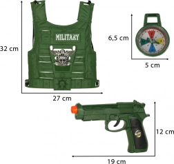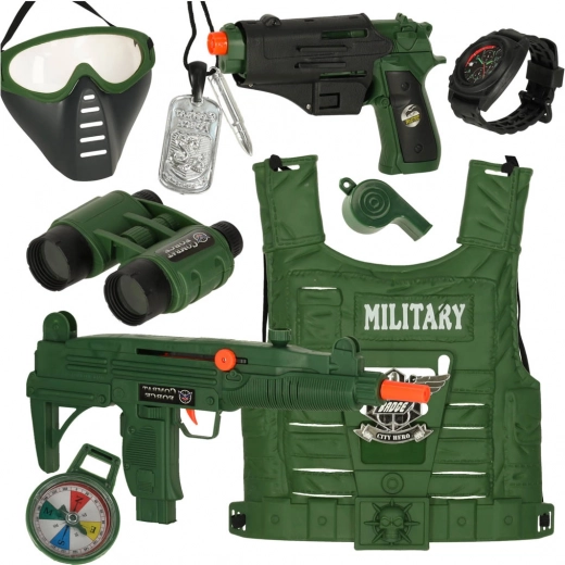 Ta vojaški komplet je idealen za vse male ljubitelje pustolovščin in vojaških iger. Zahvaljujoč temu kompletu lahko otroci doživijo razburljive misije in prigode. Vsebuje: telovnik, daljnogled, puško z mehanskim polnjenjem, pištolo na baterije, silikonsko uro, masko za oči, kompas, pravo piščalko, vojaško identifikacijsko oznako in tulec za pištolo. Vsak element je izdelan iz kakovostnih materialov in ponuja realistične detajle.